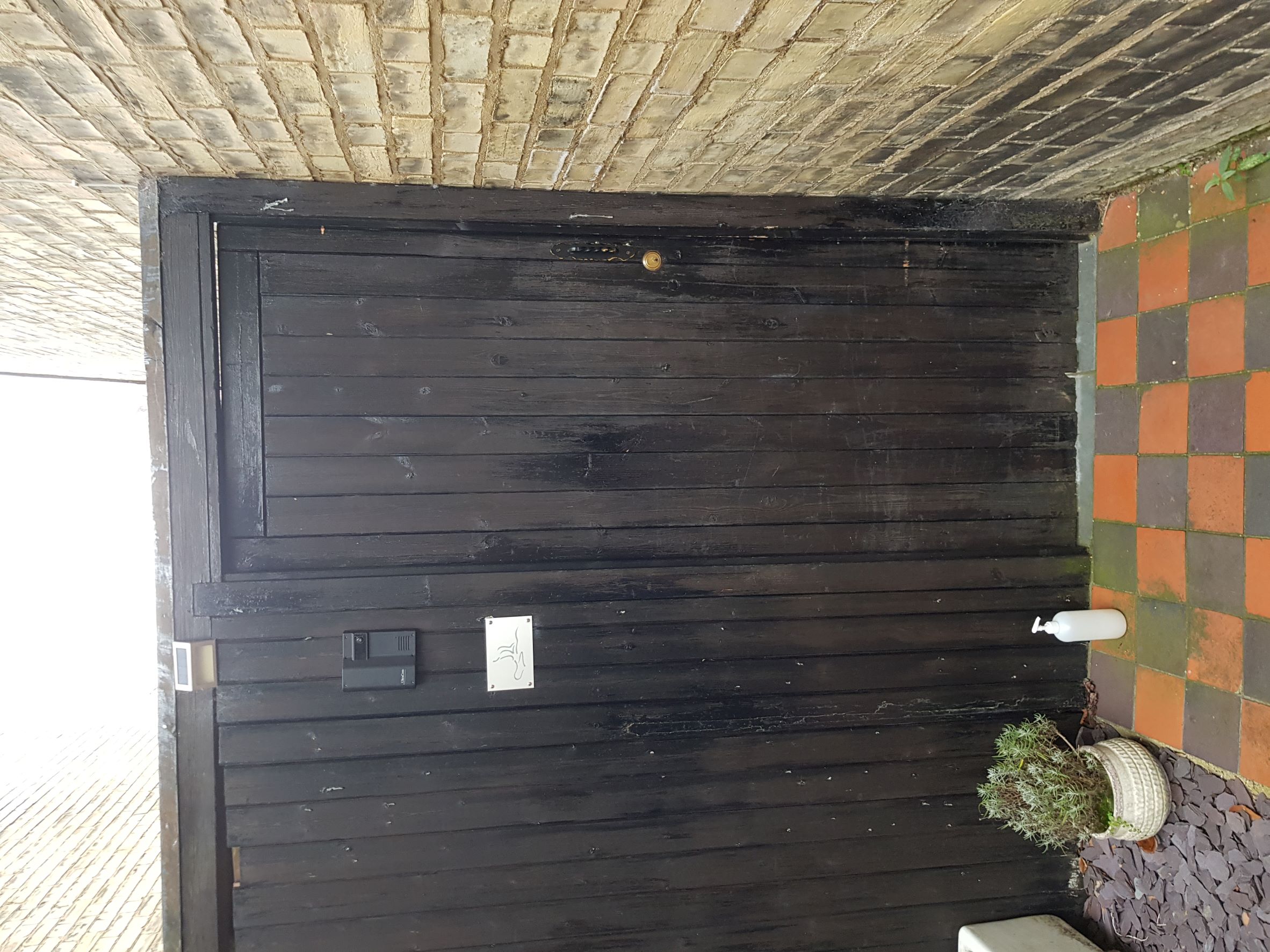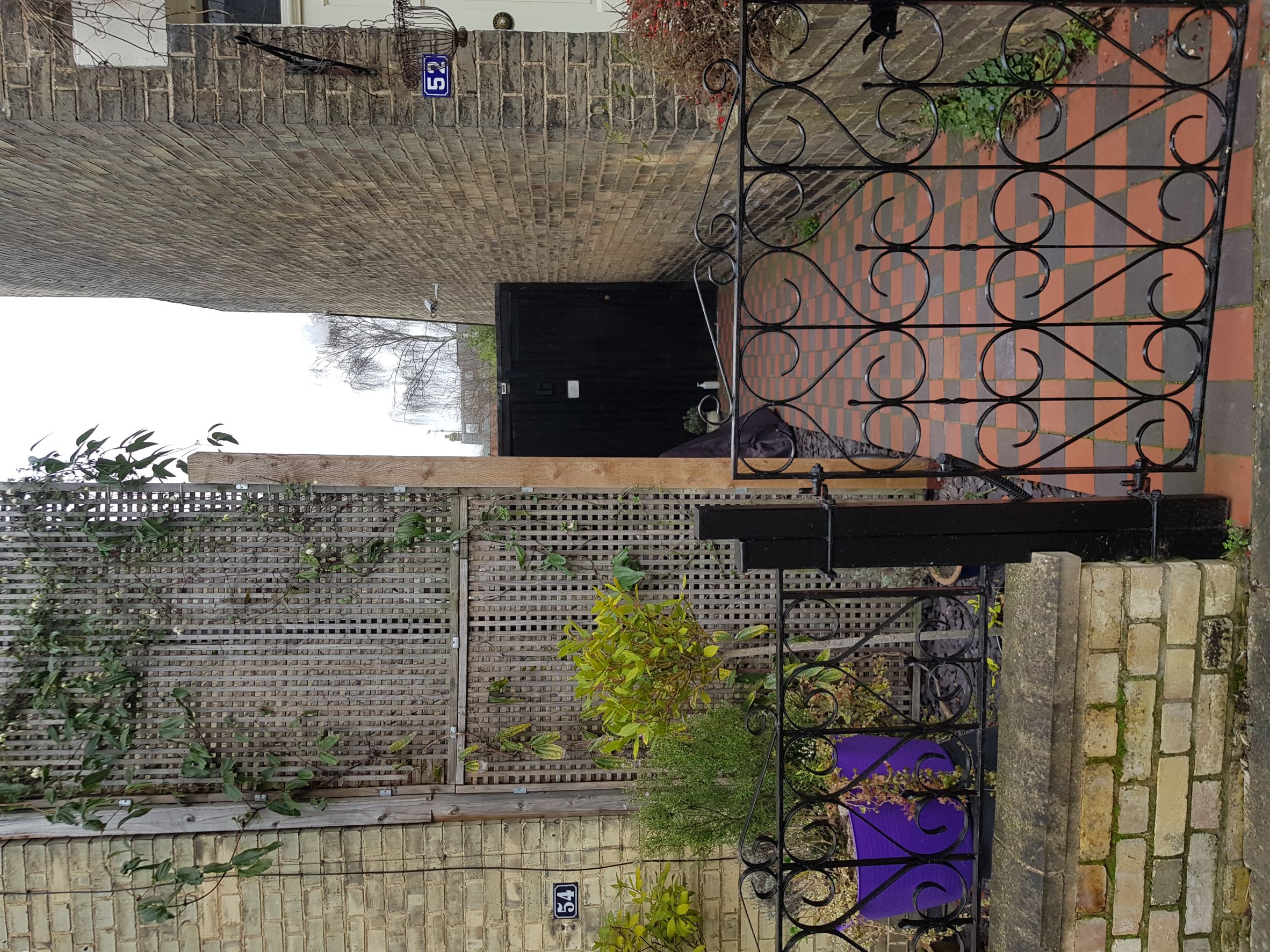 Entrance is through the wrought iron gate and press the buzzer on the black wooden gate straight ahead.